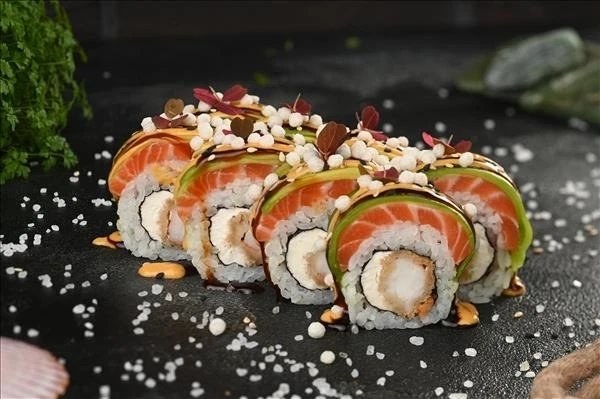 Состав: рис, водоросли нори, креветка темпура, лосось, авокадо, сыр творожный, соус манго - апельсин, соус унаги, рисовые шарики, кунжут черный и белый, микрозелень. Один комплект имбиря, васаби, соевого соуса. Стандартный вес - 340 гр. Большой вес - 420 гр.