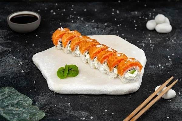 Карамелизированная филадельфия посыпаная солью "флер де сел". Состав: водоросли нори, рис для суши, сыр творожный, авокадо, лосось, сахар, соль Флер де сел Один комплект имбиря, васаби, соевого соуса. Стандартный вес - 280 гр. Большой вес - 360 гр..