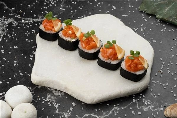 Рис, водоросли нори, сыр творожный, авокадо, лосось, лук зеленый, соль, перец, лимон. Один комплект имбиря, васаби, соевого соуса.