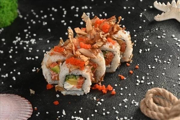 Рис, нори, огурец, авокадо, лосось, спайси соус, сыр творожный, стружка тунца, икра масаго. Один комплект имбиря, васаби, соевого соуса. Стандартный вес - 240 гр. Большой вес - 320 гр.