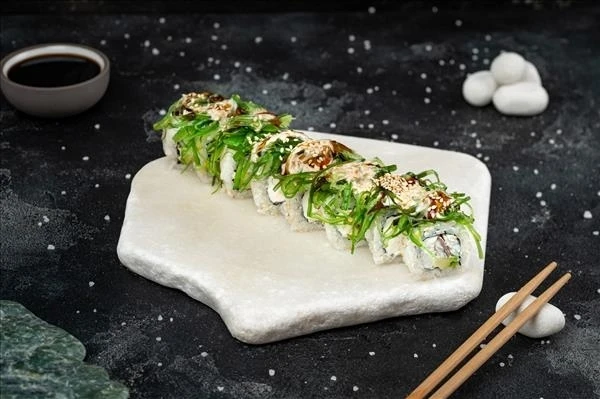 Состав: рис, водоросли нори, сыр творожный, авокадо, угорь жаренный, водоросли чука, ореховый соус, кунжут белый. Один комплект имбиря, васаби, соевого соуса. Стандартный вес - 280 гр. Большой вес - 360 гр.