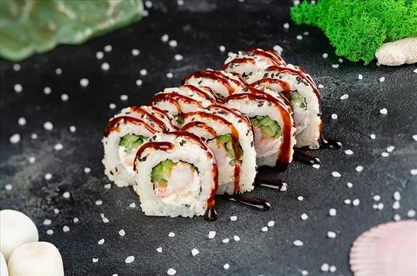 Рис, водоросли нори, огурец, сыр творожный, креветка, кунжут белый и черный, соус унаги. Один комплект имбиря, васаби, соевого соуса. Стандартный вес - 240 гр. Большой вес - 320 гр.