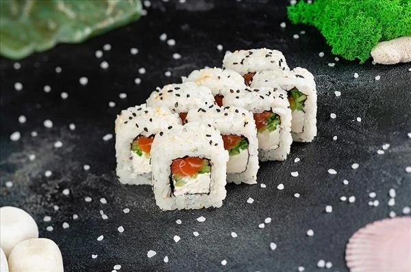 Рис, водороли нори, огурец, сыр творожный, лосось, кунжут белый и черный. Один комплект имбиря, васаби, соевого соуса. Стандартный вес - 230 гр. Большой вес - 310 гр.