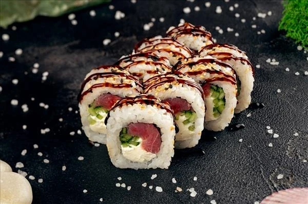 Рис, водоросли нори, огурец, сыр творожный, тунец, соус понзу, кунжут белый и черный, соус унаги. Один комплект имбиря, васаби, соевого соуса. Стандартный вес - 240 гр. Большой вес - 320 гр.