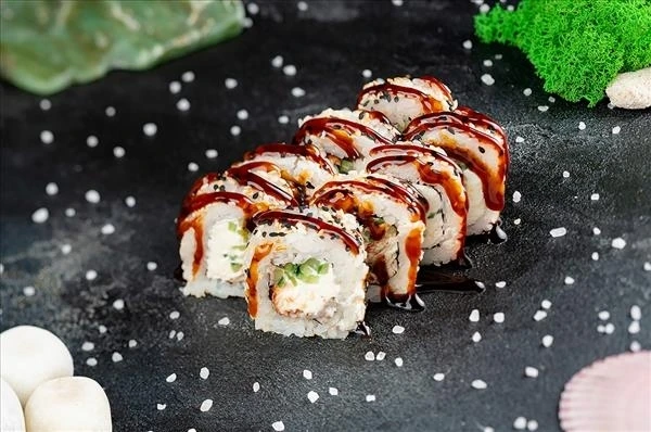 Рис, водоросли нори, огурец, сыр творожный, угорь, кунжут черный и белый, соус унаги. Один комплект имбиря, васаби, соевого соуса. Стандартный вес - 240 гр. Большой вес - 320 гр.
