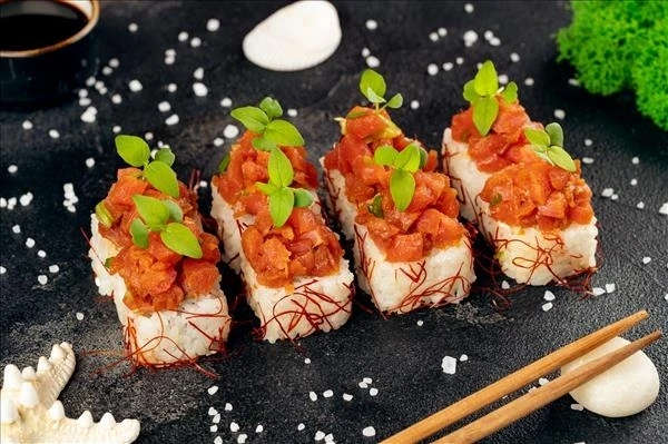 Рис, нори, сыр Cremette, авокадо, тунец, соус понзу, нити чили. Один комплект имбиря, васаби, соевого соуса. Стандартный вес - 270 гр. Большой вес - 350 гр.