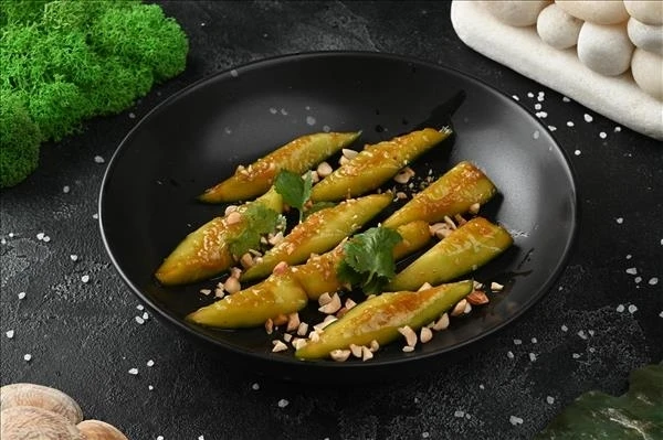 Огурец, паста табаджан, рисовый уксус, масло кунжутное и растительное, чеснок, арахис, кинза.