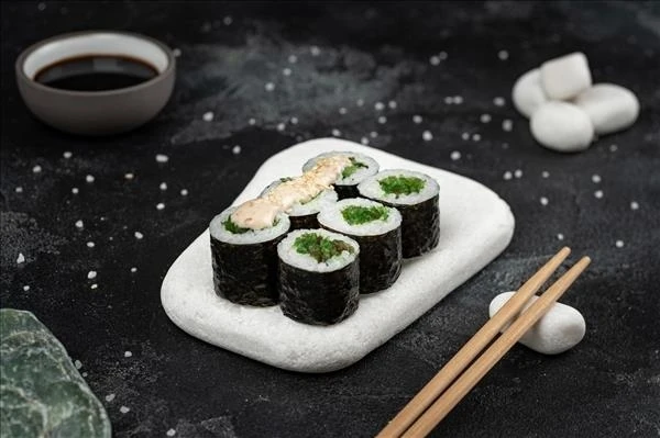 Рис, нори, водоросли чука, соус ореховый, белый кунжут. Один комплект имбиря, васаби, соевого соуса. Стандартный вес - 120 гр. Большой вес - 165 гр.